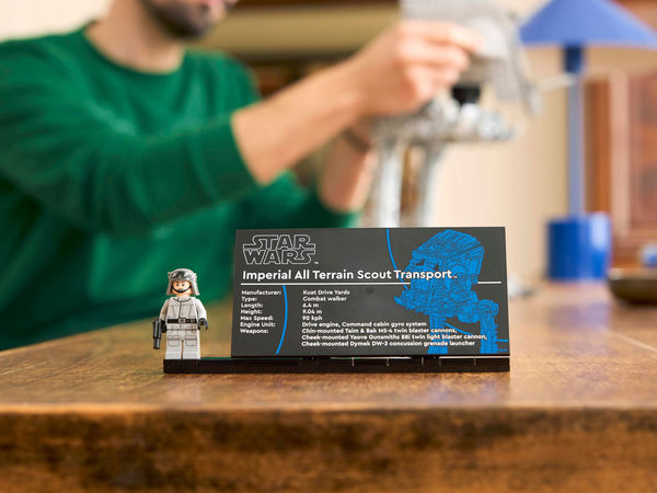• Модель для сборки и демонстрации: разместите свою модель рядом с информационной табличкой AT-ST и уникальной минифигуркой водителя AT-ST Star Wars с имперским гербом на руках и бластерным пистолетом.