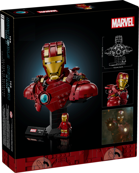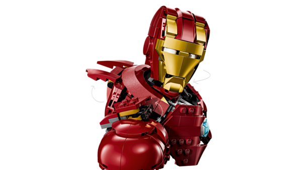 Этот набор для сборки супергероя повторяет культовую броню MK4, которую носили в фильме студии Marvel "Железный человек 2". Набор для сборки модели, состоящий из 436 деталей, включает в себя два регулируемых щитка на спине, две выдвижные наплечные пушки и вращающуюся головку. На прочном основании расположена печатная табличка с именем и съемная минифигурка Железного человека. Размер собранного бюста: в высоту 17 см., в ширину 17 см., в глубину 8 см.