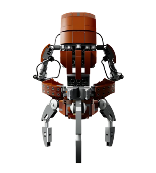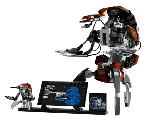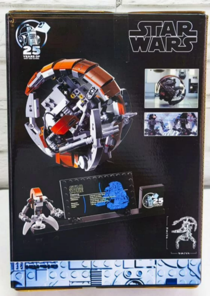 В дополнение к яркому центральному элементу этого творческого набора также имеется подставка с информационной табличкой, кубик Star Wars, посвященный 25-летию «Звездных войн», и место для прилагаемой небольшой фигурки Дройдеки. Рaзмeры coбpанного дрoидa 21x16 см