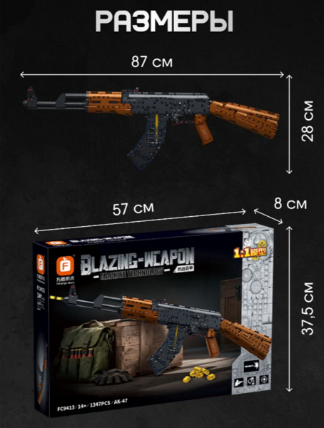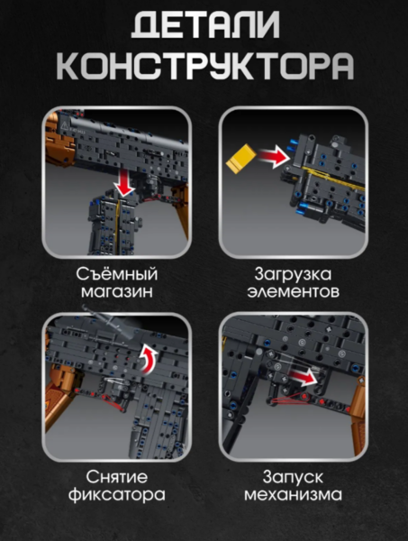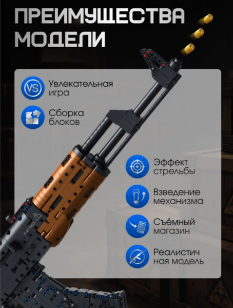 Сборная модель штурмовой винтовки AK-47 из конструктора с высокой детализацией и реалистичной механикой. Подходит для игры, сборки и коллекционирования. Модель выполнена из прочного и безопасного ABS-пластика, все элементы точно подогнаны и легко соединяются между собой. Процесс сборки логичный и увлекательный, детали можно разбирать и собирать повторно. Конструктор оснащён реалистичной механической конструкцией, включая имитацию выброса гильз, что делает игру более эффектной и приближенной к реальности. Внешний вид максимально детализирован: приклад, магазин, ствол и другие элементы тщательно проработаны.