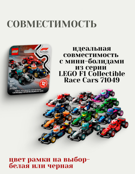 Чистота, порядок и коллекционная эстетика. Белая рамка на 10 болидов позволяет аккуратно разместить LEGO F1 Collectible Race Cars, сохранив фокус на самих моделях. Идеально для светлых интерьеров и аккуратных коллекций.