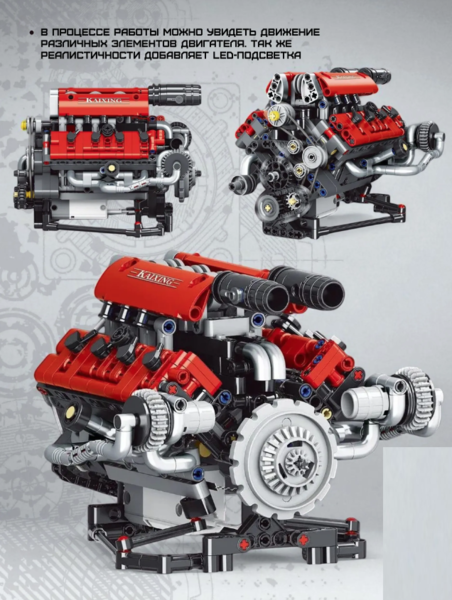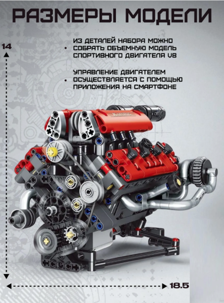 Совместим с техник. Конструктор «Двигатель Ferrari V8» – интерактивная модель для сборки. Погрузитесь в мир высоких технологий и автодизайна с этим иммерсивным конструктором. Набор позволяет собрать детализированную модель двигателя легендарного автомобиля и управлять ею через мобильное приложение.