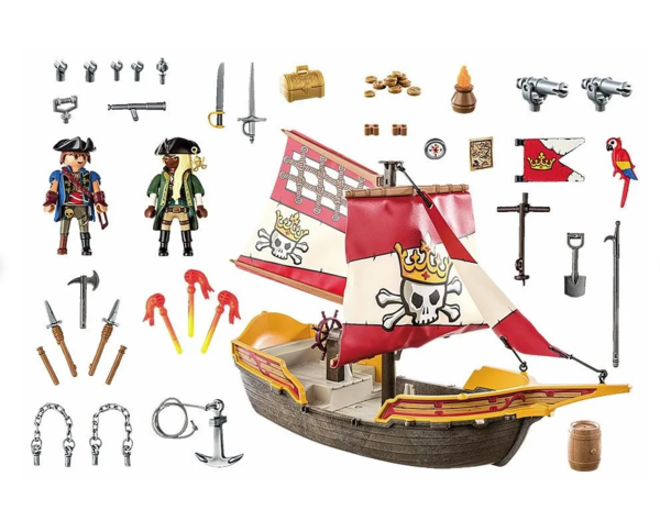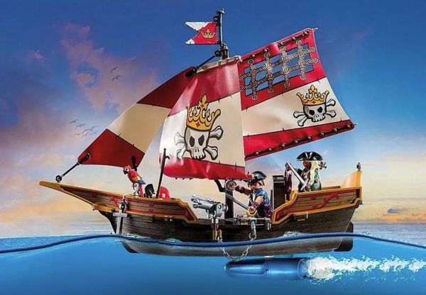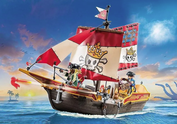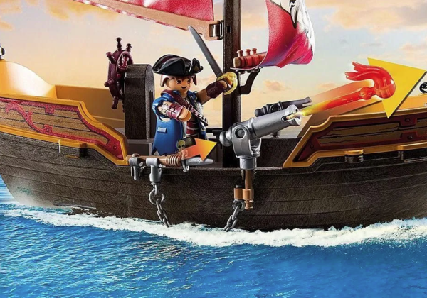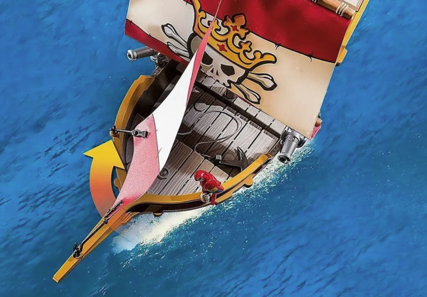 Пиратское приключение зовёт! С маневренного плавучего корабля, принадлежащего пиратской королеве, вы сможете атаковать вражеские корабли или отбиваться от опасностей пиратского мира. Благодаря вращающимся и наклоняющимся пушкам нападающие быстро сдаются. Теперь ничто не помешает вам в поисках спрятанных пиратских сокровищ... Поднимите паруса и отправляйтесь в плавание вместе с королевой пиратов и ее командой! Необычные пиратские приключения ждут всех любителей пиратства на пиратском корабле PLAYMOBIL.