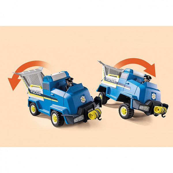 Аксессуары: 1 полицейская машина со светом, звуком и складным спойлером, тросовой лебедкой и местом для хранения вещей, 1 мини-полицейская машина.