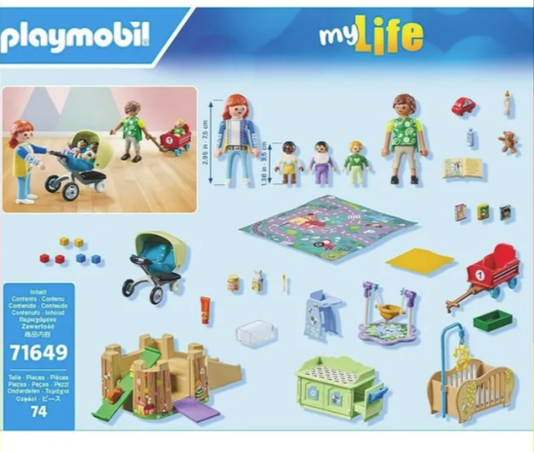 Состав набора: Фигурки: 1 женщина, 1 мужчина, 3 младенца; аксессуары: различные игрушки, 1 детская коляска, 1 двухместная коляска, 1 детская кроватка, 1 пеленальный столик, 1 стульчик для кормления, 1 слюнявчик, 1 сантиметровая лента