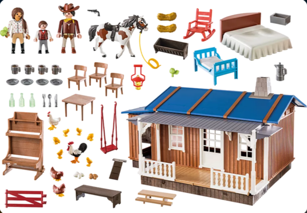Фигурки: 1 женщина, 1 мужчина, 1 ребенок; Животные: 1 лошадь, 3 курицы, 1 петух, 6 цыплят; Аксессуары: 1 хозяйственная постройка, 1 качели, 2 кровати, 1 стол, 3 стула, 4 тарелки, 4 чашки, 3 бутылки, 1 кувшин, 1 набор столовых приборов, 1 яблоко, 1 ружье, 2 пучка соломы, 1 элемент забора, 1 кормушка, 1 полка, 1 лампа, 1 лестница, 1 седло, 1 недоуздок.;