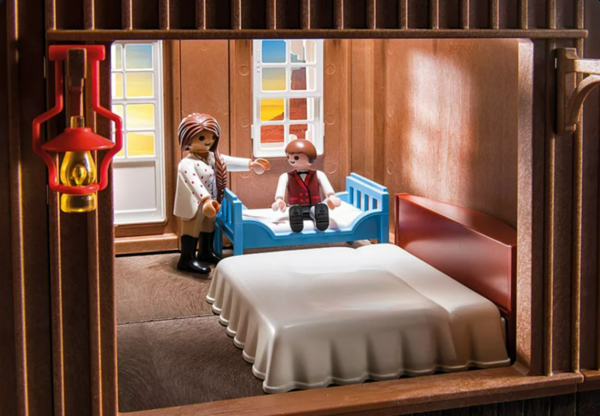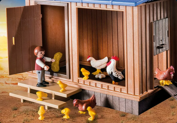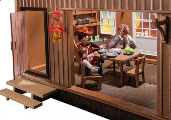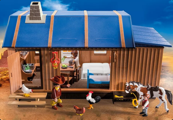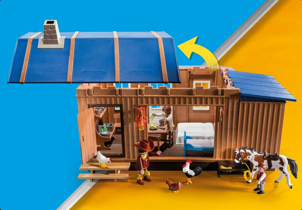 На большом западном ранчо Дикий Запад вполне себе приручен. Здесь фермерская семья чувствует себя как дома, возделывает землю и заботится о животных. В уютном фермерском доме с просторной верандой достаточно места для счастливой семейной жизни. Куры содержатся в соседнем сарае, а для лошадей есть большой загон с просторным выгулом. После насыщенного событиями рабочего дня жена фермера расслабляется в кресле-качалке на крыльце и наслаждается прекрасным видом, пока её маленький сын весело качается на качелях. Детально проработанный игрушечный набор с трогательными фигурками позволяет бесконечно придумывать игровые сценарии. В набор входят три фигурки PLAYMOBIL, лошадь, куры и цыплята, западное ранчо с кухней и мебелью, а также другие замечательные дополнения. Крышу ранчо можно снять.