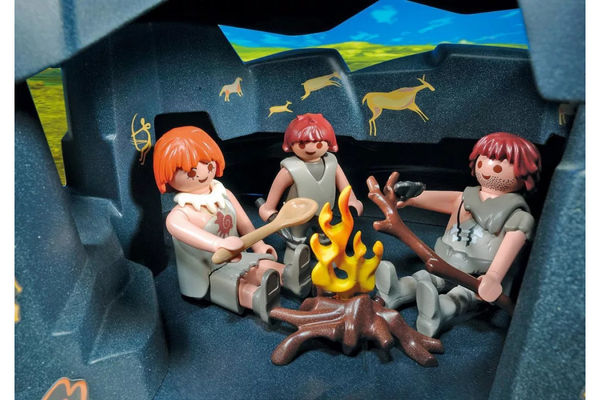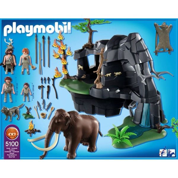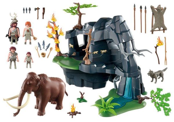 Фигурки: 2 мужчины каменного века, 1 женщина каменного века, 1 мальчик каменного века; Животные: 1 мамонт, 1 волк, 3 сельди; Аксессуары: 1 пещера каменного века, 1 пень с основанием, 1 костер, 2 копья, 1 посох с клиновидным наконечником, 1 длинная деревянная палка с вилкообразным наконечником, 3 кремневых орудия, 1 кремневый топор, 1 деревянная дубинка, 1 палка для разведения огня, 1 деревянная ложка, 1 вертел для жарки, 1 деревянное ведро, 1 половник, 1 медвежья шкура с деревянной подставкой, 1 лист с этикетками