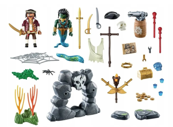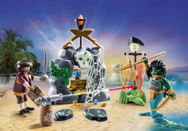 Присоединяйтесь к бесстрашному пирату в поисках сокровищ. Карта сокровищ ведет на загадочный Остров Хрустального Черепа. Судя по всему, здесь спрятан ценный артефакт в виде хрустального черепа. Однако, прежде чем пират сможет получить сокровище, он должен сначала найти правильный путь, а затем пройти мимо охраны острова. В набор PLAYMOBIL входят две фигурки PLAYMOBIL, каменное убежище с движущейся дверью из паутины, два направленных камня, работающая пушка и множество других замечательных аксессуаров. Пиратские наборы PLAYMOBIL с креативными фигурками и детализированным оборудованием подарят детям часы веселья.