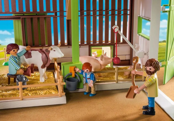 В комплекте: 1 мужчина, 1 женщина, 1 ребенок; Животные: 1 корова, 2 теленка, 1 свинья, 2 поросенка, 1 собака, 1 кошка, 2 птицы, 2 мыши; Дополнительные элементы: 1 цветочный куст, 1 зарядный кабель, 3 мешка, 1 мусорное ведро, 2 квадратных тюка соломы, 1 солома, 1 трава, 4 коровьего навоза, 1 забор, 1 тачка, 1 вилы, 1 лопата, 1 метла, 1 табурет. , 1 ведро, 1 лестница, 1 лебедка, 1 мяч, 1 грязь, 1 кран, 1 цветок.